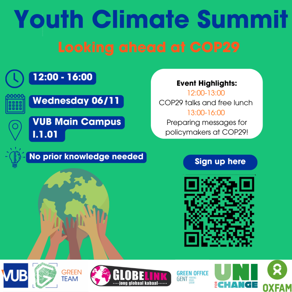 Dit jaar vindt de grote klimaatconferentie COP29 plaats in Azerbeidzjan, en jij kunt deel uitmaken van de actie! GreenTeam VUB, Globelink en Green Office Gent organiseren een energieke Youth Climate Summit, en jij bent uitgenodigd! 🌍🔥Wil je weten welke beslissingen tijdens COP29 worden genomen? En wil je de Belgische beleidsmakers en de internationale gemeenschap een krachtige boodschap meegeven? Dit is jouw kans om impact te maken! Kom op woensdag 6 november van 12:00 tot 16:00 naar de VUB en maak het verschil in het klimaatbeleid!