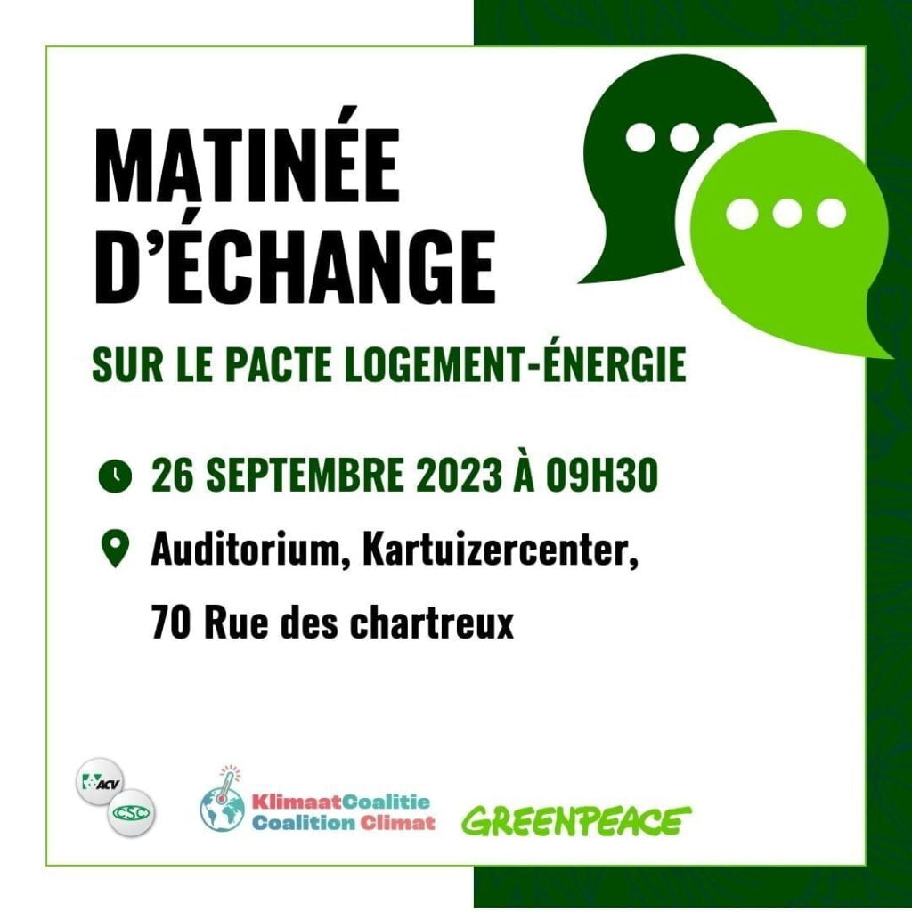 La Coalition Climat, Greenpeace et la CSC vous invitent à participer le 26/09 à une matinée d’échanges avec de nombreux acteurs et actrices du mal logement, de la précarité, du climat et de la biodiversité sur l’une de nos demandes centrales en vue des élections : le Pacte Logement/Énergie.