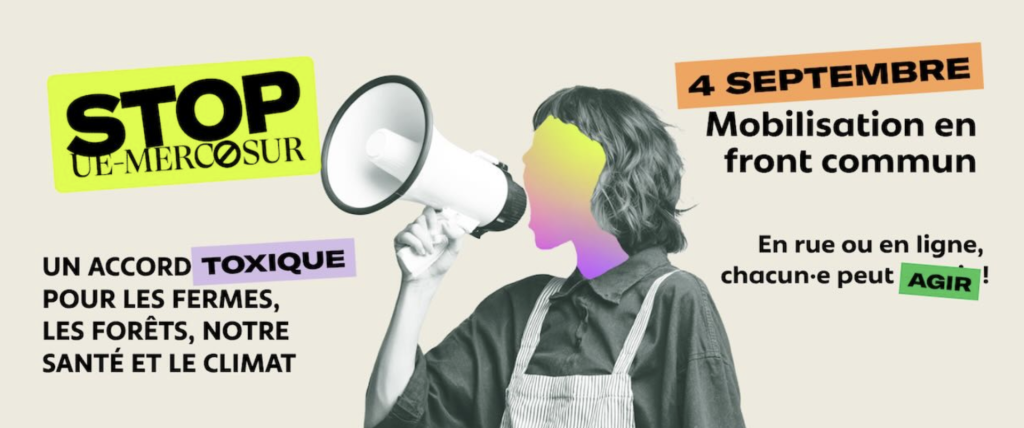 Le 4 septembre, on se mobilise en front commun, avec divers mouvements sociaux, des ONG, citoyen·nes, agriculteur·rices, activistes, syndicats, mouvements étudiants, mutuelles, associations écologistes et de luttes sociales, promotion de la santé… Toutes les forces qui s’opposent à un accord toxique pour les agriculteur·rices, l’environnement et les droits sociaux et humains – ici comme dans les pays du Mercosur (Brésil, Argentine, Paraguay, Uruguay).