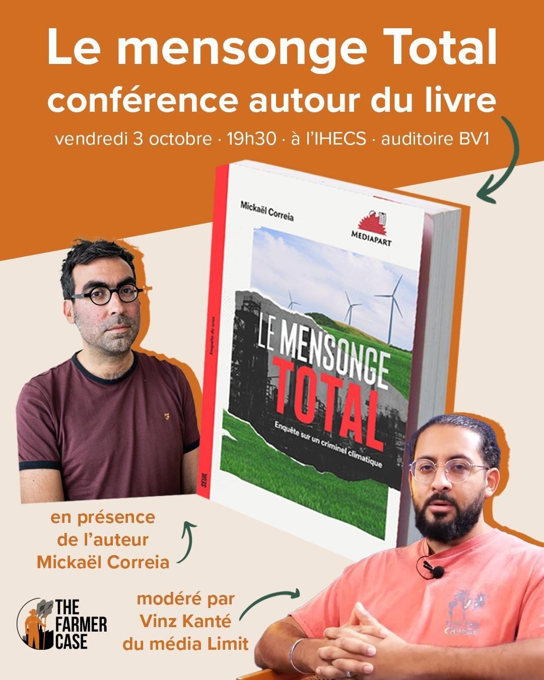 Conférence : Le mensonge Total L'équipe du Farmer Case vous invite ce vendredi 3 octobre prochain à la conférence de Mickaël Correia, journaliste de Médiapart, qui signe l'enquête "Le Mensonge Total". Pendant deux ans, il a enquêté sur les pratiques du géant pétrolier: de la fabrique du doute et la production de messages climatosceptiques à la poursuite […]