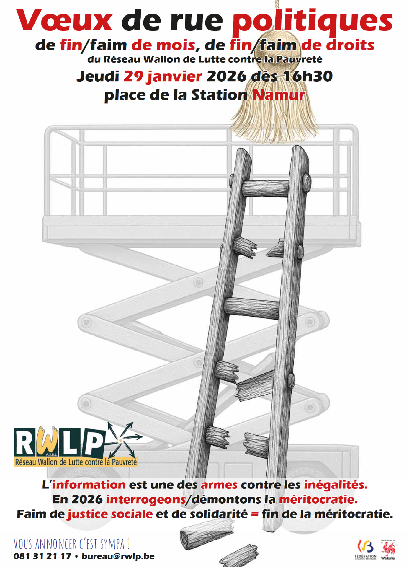 Les vœux de rue politiques du RWLP auront lieu le jeudi 29 janvier 2026 dès 16h30, place de la Station à Namur.Cette mobilisation relie pauvreté, inégalités sociales et crise climatique, qui frappe d’abord les personnes les plus précarisées.Un rendez-vous citoyen pour défendre la justice sociale, la solidarité et les droits sociaux en Wallonie. 📍 Lieu […]