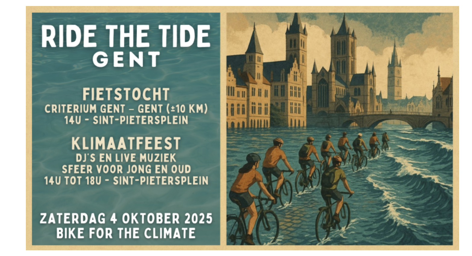 In Gent willen we dit momentum aangrijpen om met een grote, feestelijke fietstocht het klimaat op de kaart te zetten en tegelijk de toon te zetten voor de grote klimaatmars in Brussel op zondag 5 oktober, waar de Ride the Tide uiteindelijk eindigt.