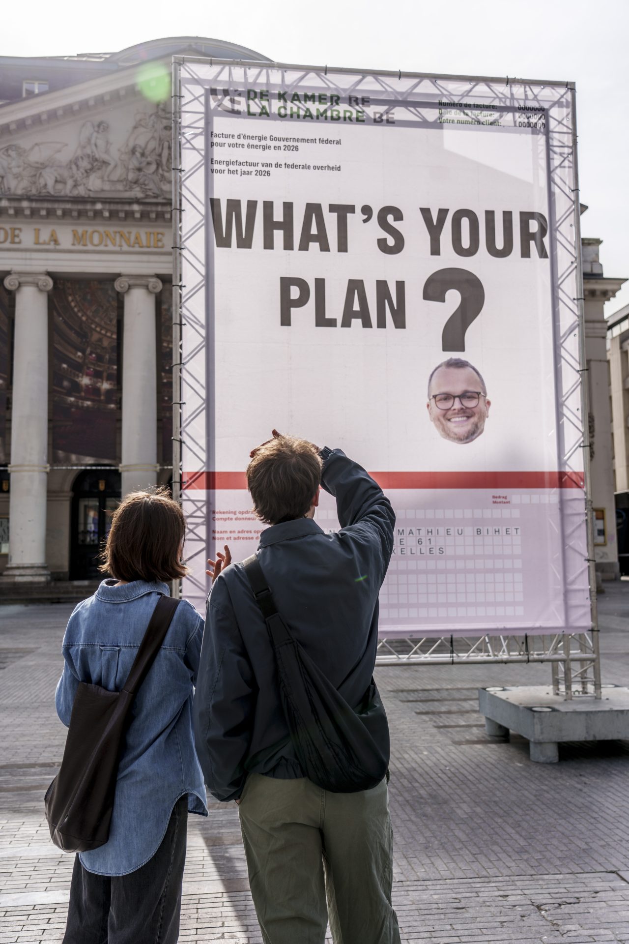 Een opvallend zicht op het Brusselse Muntplein. Waar het autovrije plein normaal vooral gekenmerkt wordt door drukke passage van voetgangers, steps en fietsers werd het plein plots gedomineerd door een metershoge factuur met een vraagteken. Op het vraagteken prijkt het gezicht van een man met de slagzin “What’s your plan, Bihet?”