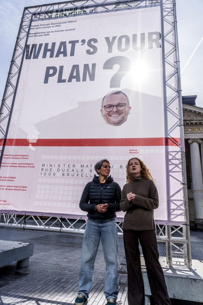 De Klimaatcoalitie trok maandag naar het Muntplein in Brussel met een opvallende boodschap: een metershoge factuur gericht aan de in volle energiecrisis totaal afwezige energieminister Mathieu Bihet.