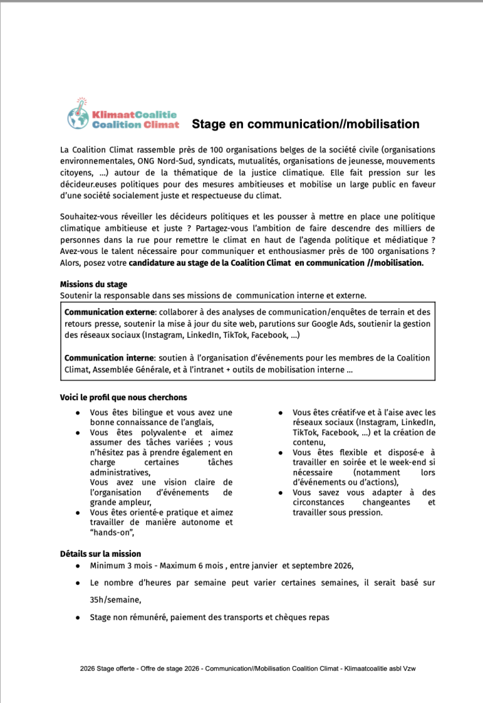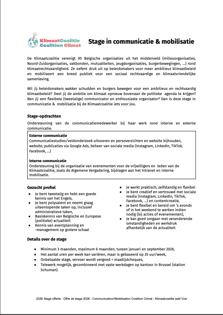 Klimaatcoalitie – Coalition Climat vzw zoekt een (tweetalige) stagiair(e) om hen bij te staan in Communicatie en mobilisatie!